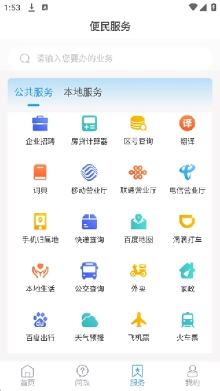 5、服务页面配备了公共服务功能,像企业招聘、房贷计算器、区号查询以及翻译等都包含在内。