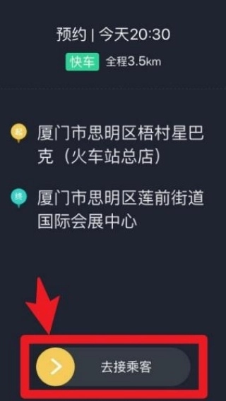 3、登录成功后进入派单界面,若收到预约订单,可查看乘客的起终点信息,点击“去接乘客”按钮即可进入接驾流程。