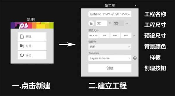 2、首次启动软件时,左侧会出现新建窗口界面,点击新建后,右侧会弹出工程创建面板。这里可依次设置工程名称、画布尺寸(普通版最大支持1024*1024)、预设尺寸、背景颜色以及样板类型。其中,“template”选项包括动画样板、图层样板和基础字体设置。设置完成后,点击“创建”按钮开始绘画。