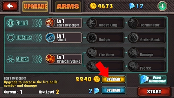 2、接着选择我们想要升级的技能,然后在下方选择使用金币或钻石升级中的一种,点击其后的Upgrade按钮即可。