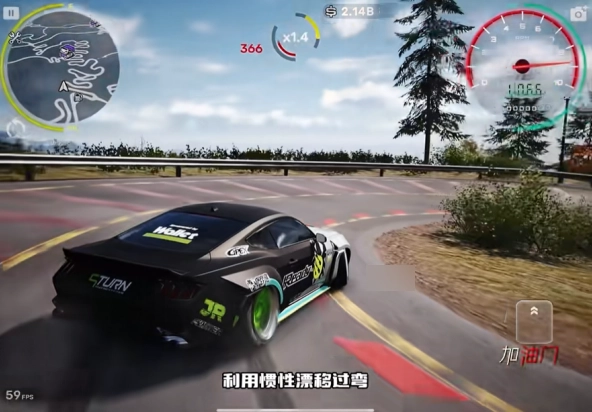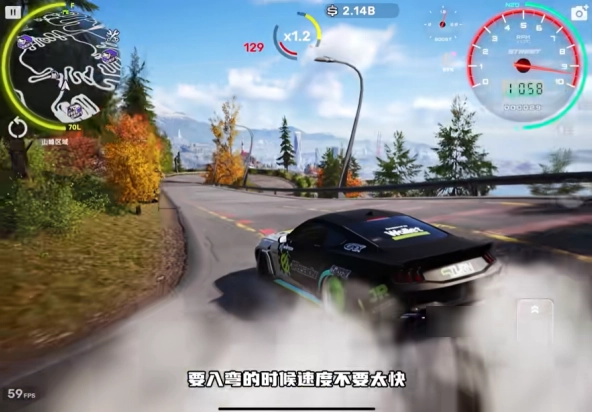 5、要是车速过快就踩刹车降速,接着拉手刹并踩油门,借助惯性完成漂移过弯。拉手刹时需留意,别一直拉着不松,轻点一下,看到车子甩过来就可以松开了。