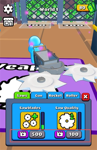可花费金钱升级锯片数量(Sawblades)和锯片质量(Saw Quality),还可解锁枪(Gun)、火箭(Rocket)、滚筒(Roller)等不同类型的武器,提升收割僵尸的效率。