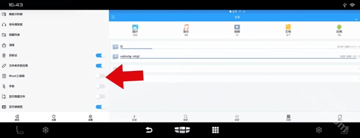 1、首次安装ES文件管理器车机版软件时,需开启ROOT工具开关。