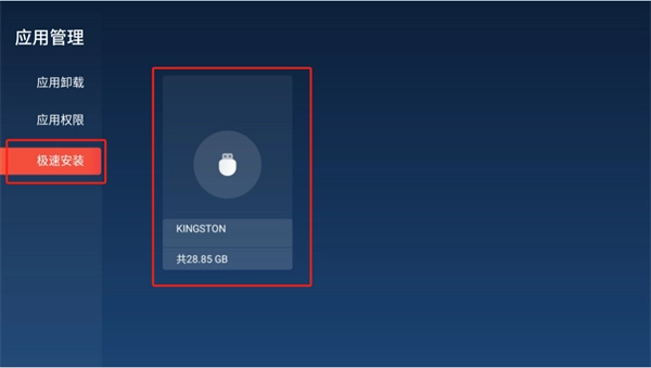 4、打开电视卫士,依次点击【应用管理】-【极速安装】选项,然后选择U盘。