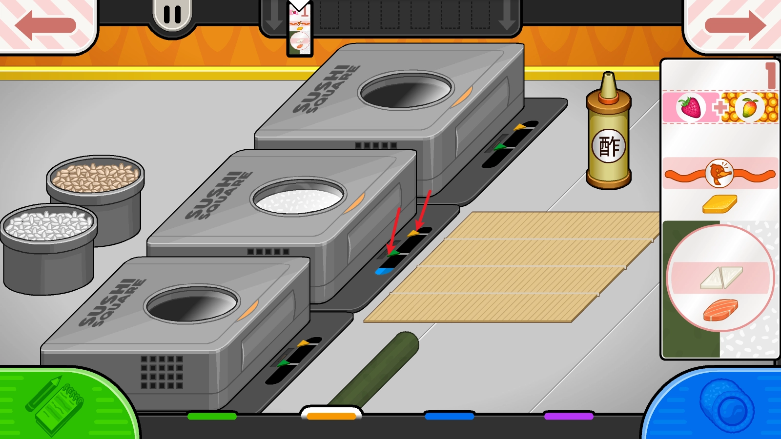 接下来要留意米饭煮熟的时机,当进度到绿色箭头位置时得加入酢,到橙色箭头位置时就该取出了。