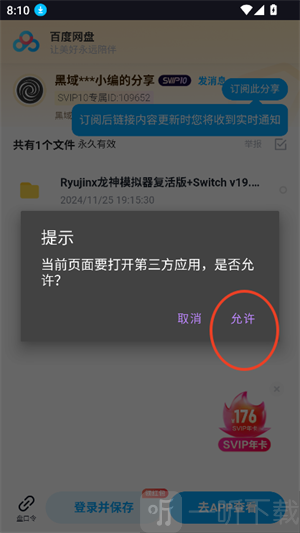 5、点击后,便能跳转至第三方网盘操作,点击“允许”即可。
