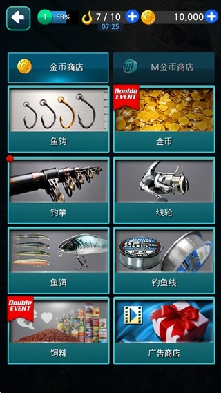 可以更换不同的鱼杆、鱼饵等道具。