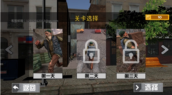 游戏的关卡按照天来分别,点击关卡点击选择等待一段时间,第1天-你必须在这个繁忙的城市里生存10天-找到一个合适的地方并要钱!奋力出击,保持活力;