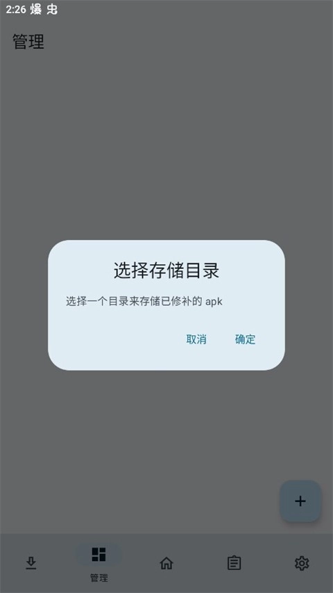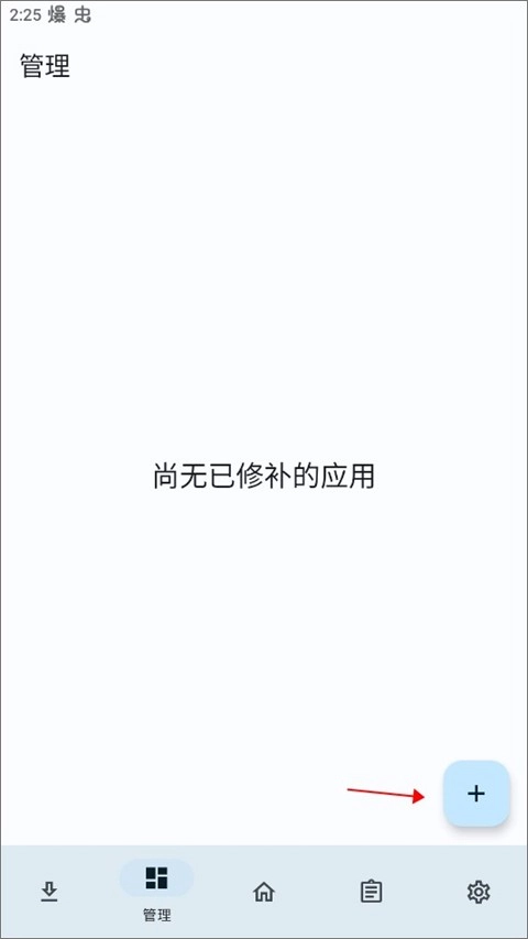 打开LSPatch应用,进入主界面后点击底部的“管理”选项卡,接着点击右下角的加号按钮。
