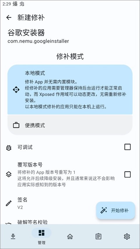 选择好应用后,可依据自身需求挑选修补模式,再点击开始修补按钮。