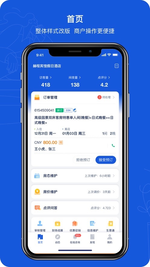 携程ebooking酒店商家,软件内的功能都是很实用的,适合不同类型的酒店商家在这里进行使用。你只需要根据自己的酒店的添加来进行管理,在首页内就可以看到酒店的信息,包括访问量、点评等内容,还有更多全新的订单,都能够直接看到并且来操作!