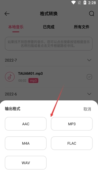 4、接下来就能够挑选输出格式了,像AAC、MP3、M4A、FLAC、WAV之类的都包含在内。
