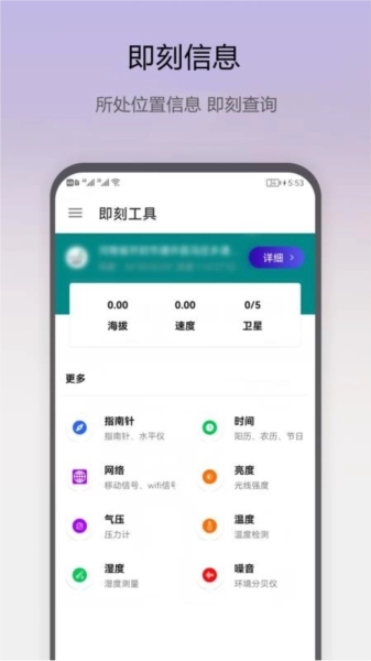 即刻工具是开封乐凡网络科技有限公司开发的一款非常好用的日常工具应用,在软件内你可以看到当前的各项信息,如坐标、海拔、地址等,以及所处地点的磁场、气压、湿度与温度等数据,方便大家可以对自己所处位置的有更多的了解,同时你也能使用软件去获取手机信号的强度,从而帮助你找到信号最好的地方,还有超多内容等你来发现,指南针、天气信息、日历信息、测海拔、测气压等等,让你以后可以使用更多的功能,这样你的手机才会变得非常的强大,给用户带来更方便的查询体验,即刻工具免费版提供的工具都是可以直接进行使用的,这里的各种工具都可以自由切换使用,以后就能随时掌握自己所在的位置、天气、湿度、气压等相关的环境数据,根据各种环境数据就能制定最合适的生活、工作方案了,给你最好的生活体验。