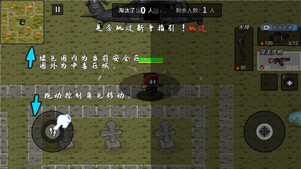 3、游戏中绿色圈内为当前安全区,圈外为中毒区域。拖动方向键可控制角色移动;
