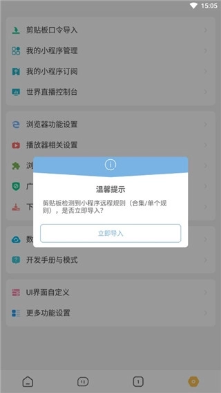 要是口令或者链接的话,和单个规则的操作相同,复制口令后打开软件首页就行;如果是文件,则需进入设置->我的小程序管理->左上角菜单选择从本地导入。