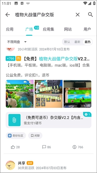 可以使用前缀“国际版”来缩小搜索范围,也可以点击广场来检索分享内容。
