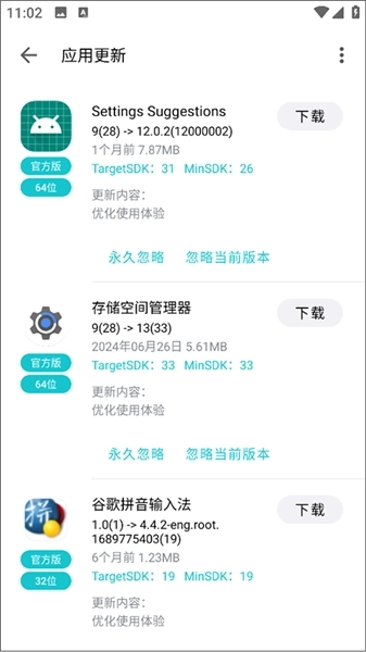 在“我的”页面打开“自动检查更新”功能后,软件就会推送已安装应用的最新版本。