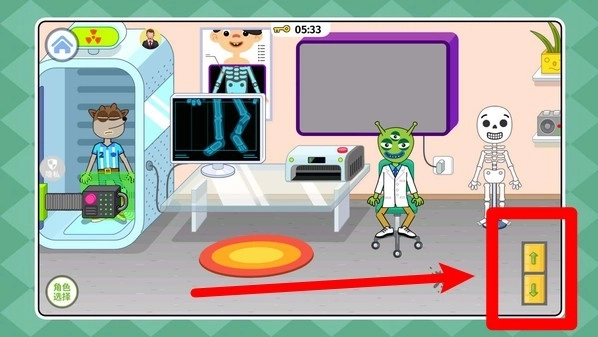 3.点击右侧的上下箭头可操控电梯移动,前往不同楼层探索更多科室和有趣设施。