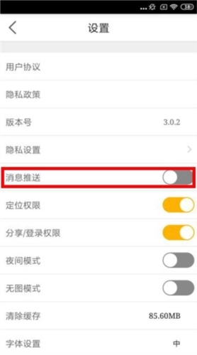 3、最后在【设置】页面里,找到【消息推送】栏目,点击其右侧的按钮将其关闭,待按钮变为灰色状态就完成了。