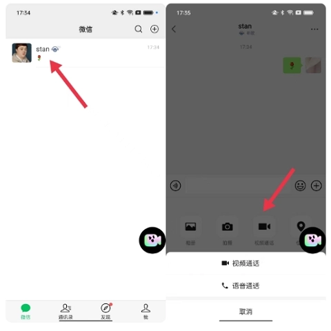 3、点击「开启视频通话」按钮,随后打开微信应用,从中找到需要进行视频通话的对象。