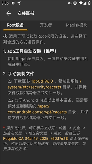 想要让自己的安卓设备获取最高权限,你可以依据自身的操作经验来选择合适的方法,也能借助搜索引擎去查找详细的步骤。之后,按照找到的指引完成相关证书的配置工作,具体的操作界面可以参考下方的图片示例。