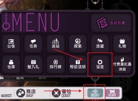 1、点击主页右下角菜单,找到设定按钮。