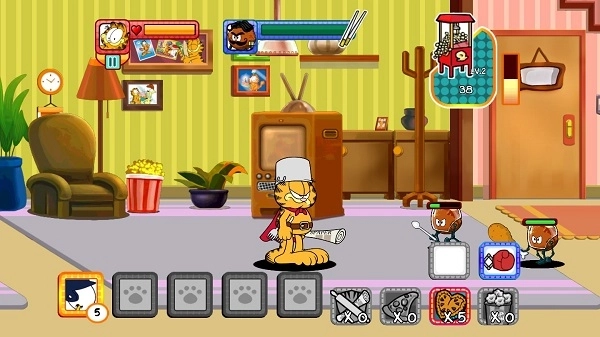 游戏的画面与音乐完美延续了加菲猫漫画的风格,人物形象和动作都透着熟悉感,就连胜利时加菲猫那副贱兮兮的笑容也清晰可见,每一处细节都称得上经典。搭配上慵懒的爵士配乐,更是把加菲猫既懒惰又贪吃,却会为了食物奋力反击的特质展现得淋漓尽致。