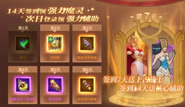 只要连续登录游戏,每天都能领取不一样的奖励,像上古召唤卷轴、上古魔灵这类道具都包含在内。