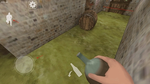 2、通过滑动摇杆来操控人物移动,点击左上角的“人物”按钮可让人物做出下蹲动作。