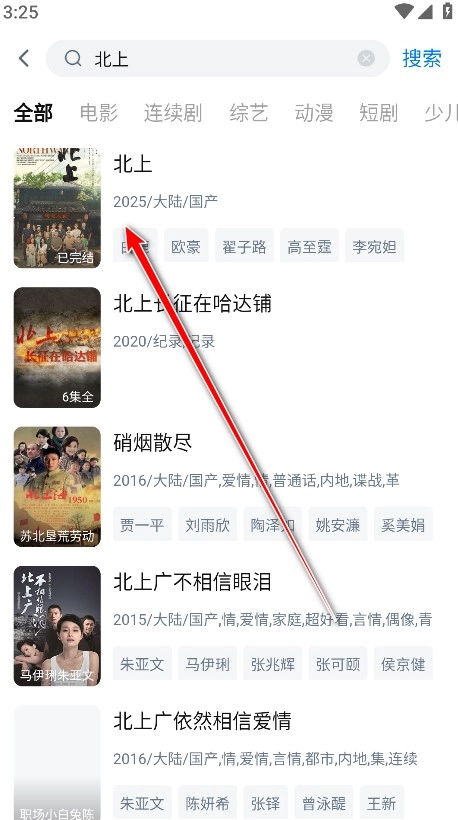 2.在搜索框输入电视剧名称,这里以搜索电视剧《北上》为例,接着点击右侧的搜索按钮。