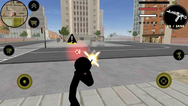 左侧负责移动和加速操作,右侧对应绳索与攻击(含跳跃功能),跳跃键独立设置,右上区域的武器切换界面以及血量、经验值的动态数据均实时刷新,状态信息一目了然。玩家可自由选择战斗风格,与其他帮派成员展开激烈交火——击杀敌人能积累经验值,连续击杀会提升通缉星级,届时警察与周边角色将对你发起猛烈围攻。你的核心目标,便是在危机四伏的环境中存活下来,并成功消灭对手。