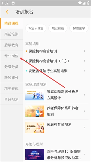 在培训报名页面中找到并点击【专业岗位】分类选项,即可浏览该分类下的专业岗位类培训课程。