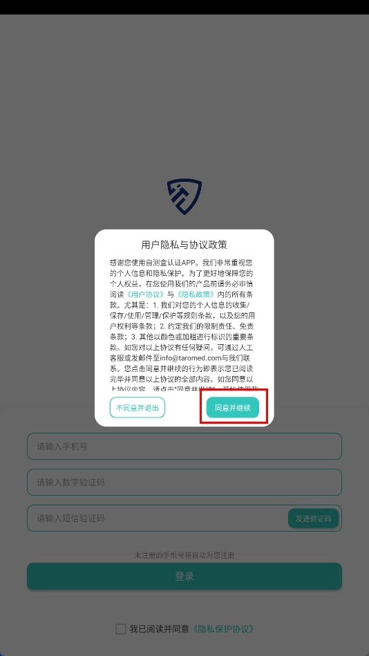 点击【同意并继续】功能按钮,以确认用户隐私与协议政策。