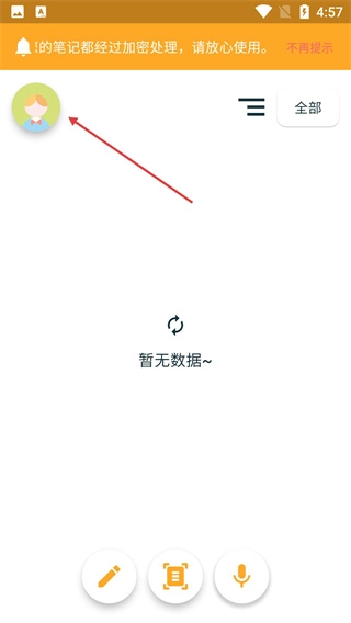 在笔记类应用的主界面中,点击左上角的头像,即可进入账号相关操作页面(例如登录或注册)。