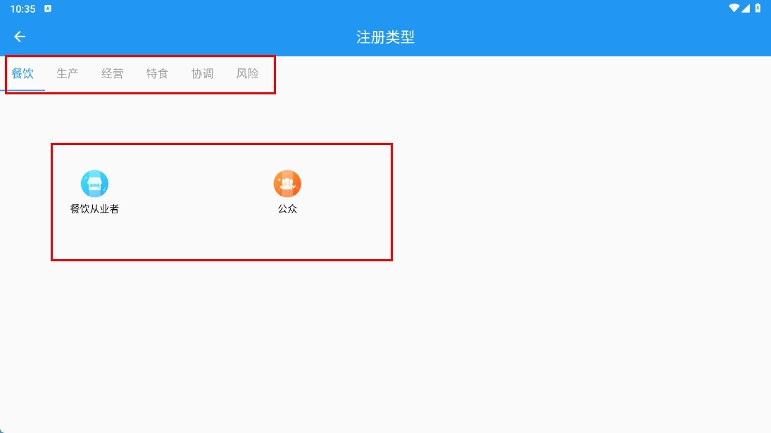 在注册类型页面,请选择【餐饮-注册分类】分类下的【餐饮从业者-用户类型】这一选项。