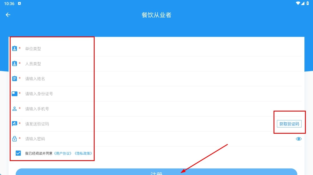 在餐饮从业者注册页面,填写单位类型、人员类型等相关信息,获取验证码后即可完成注册流程。