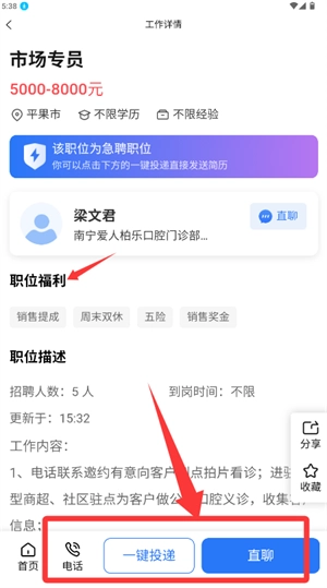 最后在岗位详情页面,借助投递、直聊等功能和招聘方取得联系。