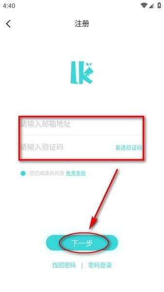 接着输入邮箱地址,获取验证码并填入,点击“下一步”;