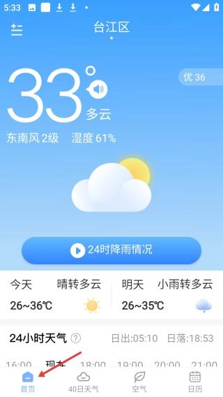 在本站完成安装后点击打开进入,即可查看台江区的实时天气情况,页面会展示当前气温33℃、天气状况为多云,同时呈现东南风等气象信息,此外还有24小时降雨查询按钮。