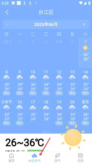 点击40日天气预报页面,即可查看台江区6月份的天气情况,其中包含每日的温度及天气状况信息,能帮助用户提前安排行程。