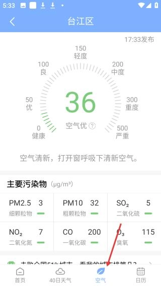 点击空气质量页面后,会显示出台江区当前空气质量为优,对应的空气质量指数是36,同时还会列出PM2.5等主要污染物的具体数值,并给出相关的空气健康建议。
