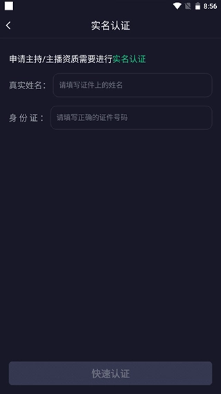 实名认证完成后,系统会询问用户是否申请主持或主播资质,只有具备该资质的用户才能创建聊天房。