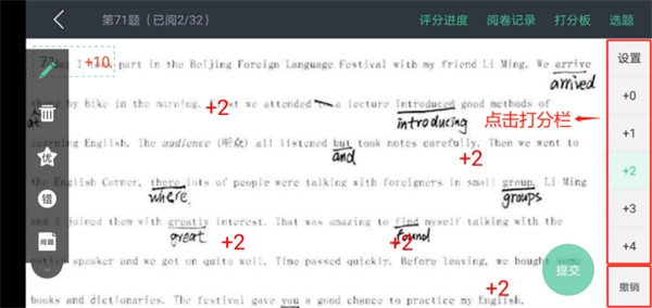 点击分数后,左上角对应题目虚线框内会显示分数,右下角会弹出【提交】按钮,点击该按钮即可完成提交。