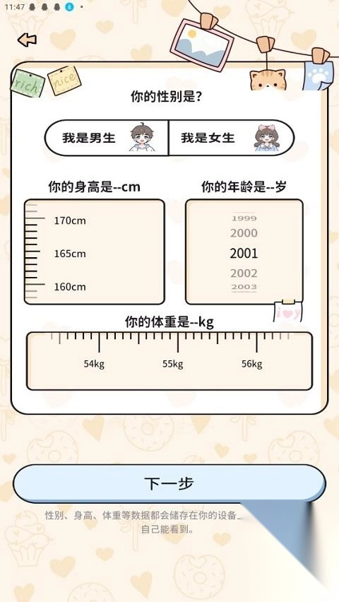 1、首先,在这里输入你现阶段的身高、年龄以及体重信息。