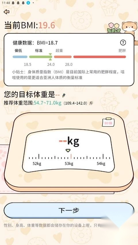 2、输入完成后,可通过当前界面了解健康数据,包括你要完成的目标体重。