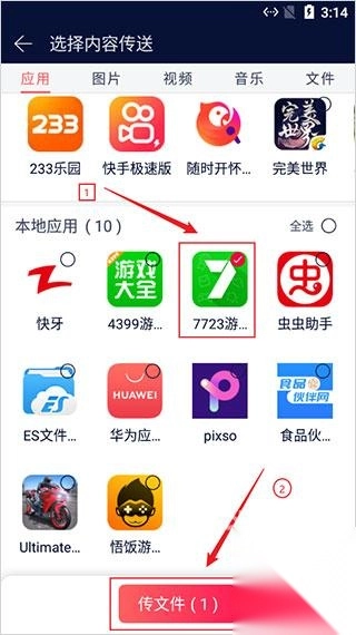 6、选择完需要传输的文件后,点击下方中间的传文件按钮即可开始传输