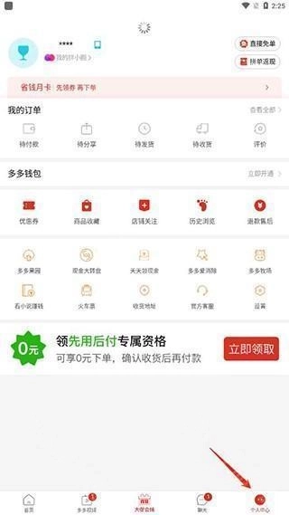 1、打开拼多多,点击个人中心,进入设置;