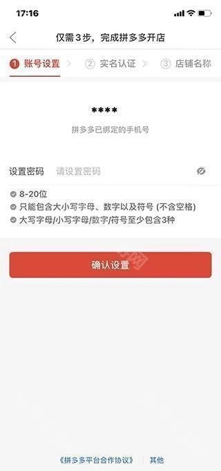 4、选好店铺类型后,拼多多开店仅需三步即可完成,第一步是设置账号,先绑定手机号,再设置密码。
