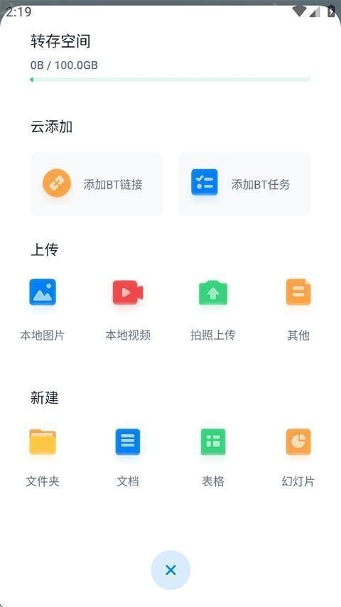 2、点击首页右下角的+按钮,您可以在此上传图片、视频、文档至云盘,也能在云盘内新建文件夹、文档、表格以及幻灯片等。