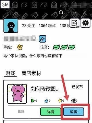 4、进入编辑页面后,按照步骤1选择“发布游戏”,再按照步骤2选择“绘制图标”,就能直接在原图标基础上进行修改啦。最近天气转凉,我给小猪添了条围脖,哈哈,效果如何?是不是挺简单的?